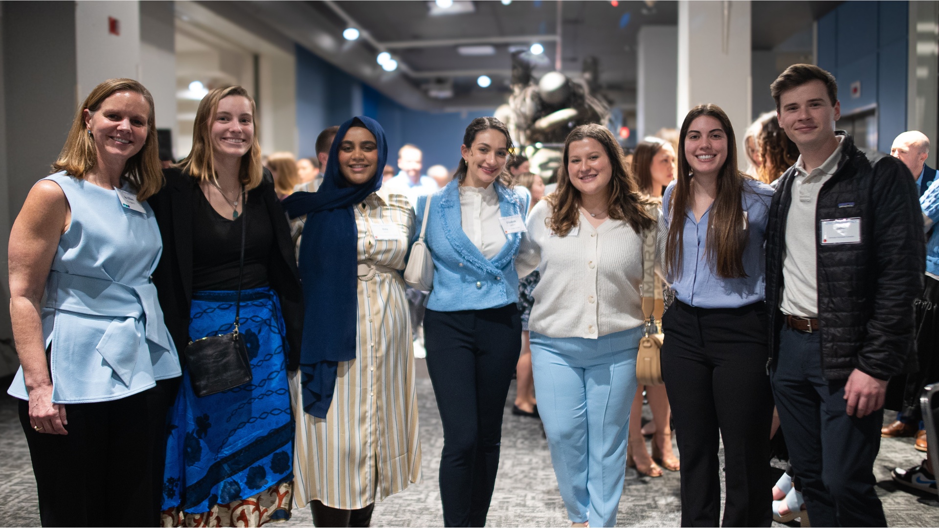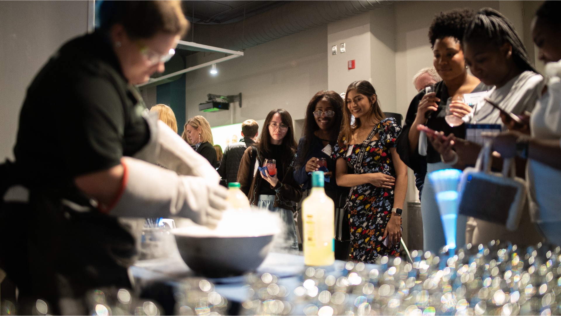 Attendees enjoyed scavenger hunt bingo among the museum’s space-themed exhibits, liquid nitrogen cocktails, prizes including basketball tickets, mini-reunions (Kappa Psi and Class of ’84!), and the collective effervescence of being together with fellow alumni and students. Even Pharmeses dressed up for the occasion in his best (space) suit and Pharmeses Junior took a spin in the space capsule!